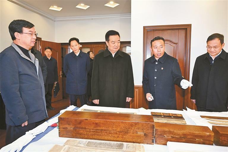 3月18日,自治区党委书记王君正宣讲全国两会精神并调研城市建设、文物保护、财政等工作,检查指导全区树立和践行正确政绩观学习教育开展情况。这是王君正在自治区文物局认真听取第四次全国文物普查、贝叶经等古籍文献保护利用、学术研究、文物安全监管平台运行等情况介绍,察看考古发掘成果展示。本报记者 李洲 摄